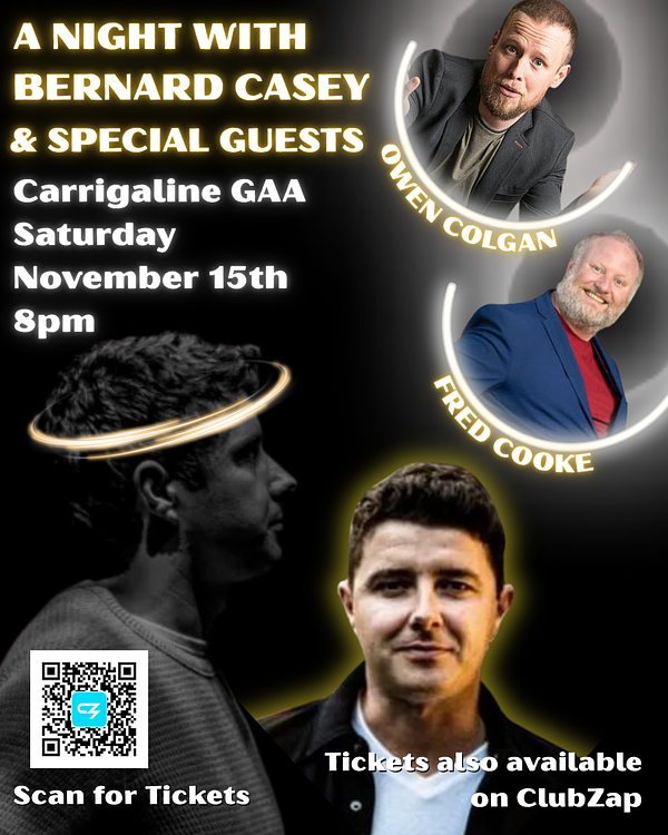 ๐๏ธ Tickets available by scanning the QR code below or Click the link https://carrigalinegaa.clubzapevents.com/comedy-night-with-bernard-casey-and-special-guests-fred-cook-and-owen-colgan-01k634rbk1gv394rjxvvy1r9h9